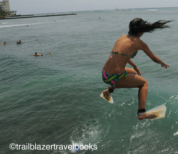 Local wahine enjoying Spring Break on Oahu. Timing the wave is crucial as is knowing how to shallow jump.