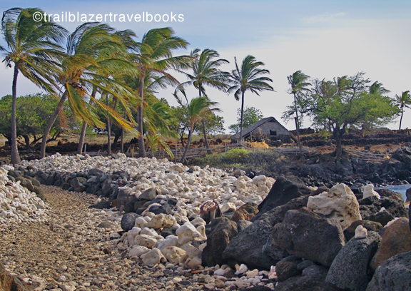 One of the first areas to be preserved, about 50 years ago, was Lapakahi State Historical Park. The villlage quietly receives the surf on the west coast of Kohala as it has for some 800 years. Kohala is the green nub on the north of the Big Island, with Maui rising across the channel. Pathways wander through the central village site and the surrounding 300 acres that were once agricultural terraces. The onset of cattle ranching in the 1800s (Parker Ranch, the nation’s largest, is up the slopes of the mountains) disrupted water supplies and sent marauding cows through these lands, spelling doom for the village. The lava stone platforms and wall that remain today were once the foundations of hau-branch structures, woven together and supporting roofs of thatched ki leaves and with floors made cushy with mats. See page 41 of Hawaii the Big Island Trailblazer. (BTW: the birthplace of The Great One, King Kamehameha is not far away on this coast.)