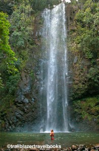 Paddlers who take the right fork will pass Kamokila Village (where some of the movie Outbreak was filmed) and come to where the river reaches rocky shallows. From there a well-used trail leads for about a mile to tall Uluwehi (Secret) Falls. Chilly waters beckon swimmers. Tour companies bring their charges here, but the place still delivers the thrill. See page 98 of Kauai Trailblazer.