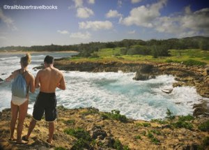 Yes, you skirt a golf course (one of Tiger’s favorites), but you also touch history at the site of Ho’ouluia Heaiau, a largely-intact temple. The bluff trail descends through a geologic swirl and drops you at Gillan’s Beach. From there you can pound sand (and more bluffs shaded by ironwood trees) to wild-and-remote Haula Beach. For a complete list of the hikes in this area consult your Kauai Trailblazer . Historical details and and a virtual tour of the trail can be found at Hike Mahaulepu .