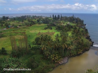 The Keanae Peninsula is about halfway along the Hana Highway, formed when a zillion cubic feet of lava blew out the west side of Haleakala’s Ko’olau Gap and fanned into the ocean. Although on this day rain made the conditions less than ideal, Keanae serves up to spots to take a dip in fresh water: The first, shown above, is near the village where the stream flows along the cliff and meets the river at a gravel bar, forming the Keanae Pool. It’s huge.