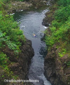 The second spot, known as Sapphire Pools, is hiding in plain site just below the highway at the turnoff to the village. You need to climb down to it, but the trail is not bad. A deep pocket of bedrock makes for clean, clear water, even on a day like this. When the sun make a direct hit, the water is sapphire blue.