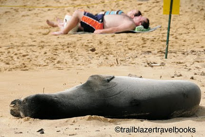 3. If you see a large-bellied creature on the sand—and it is not sunburned—stay back at least fifty feet. Hawaiian Monk Seals, the only mammals besides an obscure species of bat to occur naturally in Hawaii, like to sun themselves on the sand. Kauai is the island that hosts the most seals, both at wild beaches and those with lots of people. Conservation groups put a rope barrier around the animals when a report is made, but at remote beaches this is not the case.