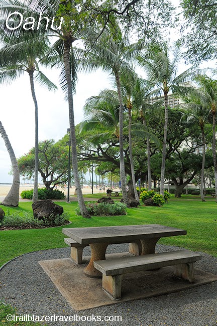 Oahu: Tucked into the hubbub of north Waikiki are two treed parks that front white sand: Duke Kahanamoku and Ft. DeRussy. After sunset, fireworks shows blast off weekly from the Kahanamoku Lagoon at the Hilton, which is closeby. For a big-scale ohana picnic scene, head to Ala Moana Beach Park, just north of Waikiki. The renowned Ala Moana Shopping Center is across the street with many takeout food options.