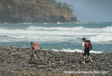 The trail starts out along the backshore of Polulu Beach, at the foot of a large dune now grown over with trees and groundcover. It then climbs seriously on a route that dips into and out of a series of rugged valleys on a 20-mile run to Waipio Valley, which is the end of the highway on the northeast tip of the island. The first two valleys, Honokane Nui and Honokane Iki, can be reached by prepared dayhikers (7.5 miles round trip, with 2,200 feet of elevation). But the rest of the trail is basically terra incognita.