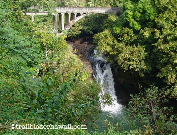 … get an airborne view like this as you freefall. Greenery disguises drop offs. The lush forest also can become a maze without exit. Forget about using GPIS to find routes. Stay on the trail and don’t venture into the forests. Getting lost is fairly certain, and unseen earth cracks and lava tubes provide trap doors to deep dark places. (On the other hand, don’t fret about poisonous insects or snakes since there are none in Hawaii.)