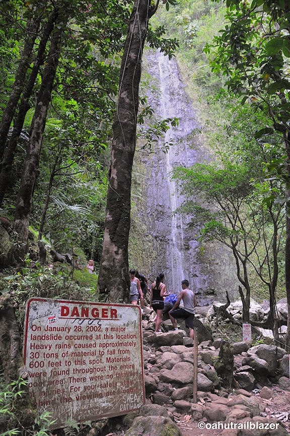Lots of people make the 1.5-mile round-trip hike to Manoa Falls, a classic tropical white ribbon falling down a 200-foot cliff. As the sign indicates, don’t dawdle under the water. Local tour companies charge unsuspecting tourists to get here, even though the trail is public, easy to find, and just a few minutes up Manoa Valley from Waikiki.