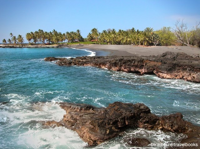 A grove of cocopalms provides plenty of shade and ambiance at the backshore. The village is five miles down a winding road, about 32 miles south of Kailua-Kona. Miloli’i is an authentic fishing village—definitely not a tourist town. Some visitors may be put off by the haggard look of the place, a blessing really, since it is seldom crowded.