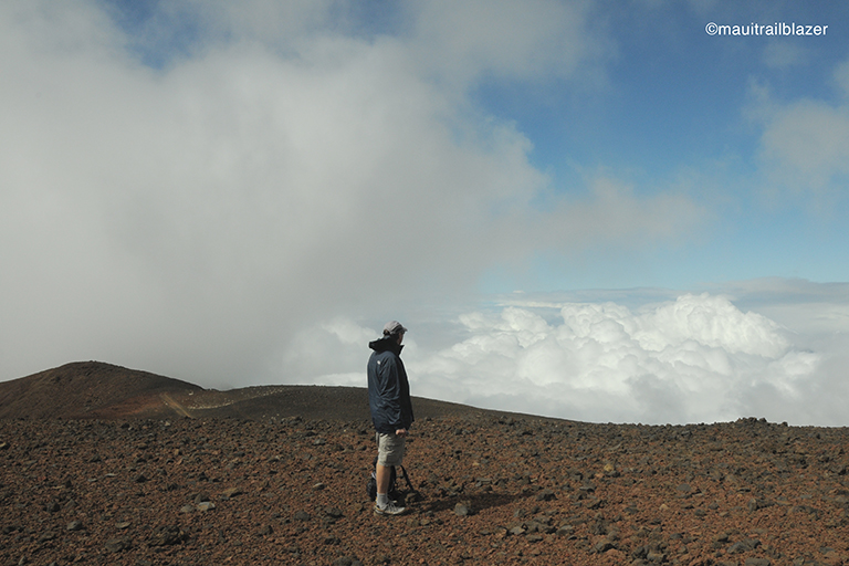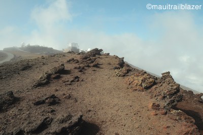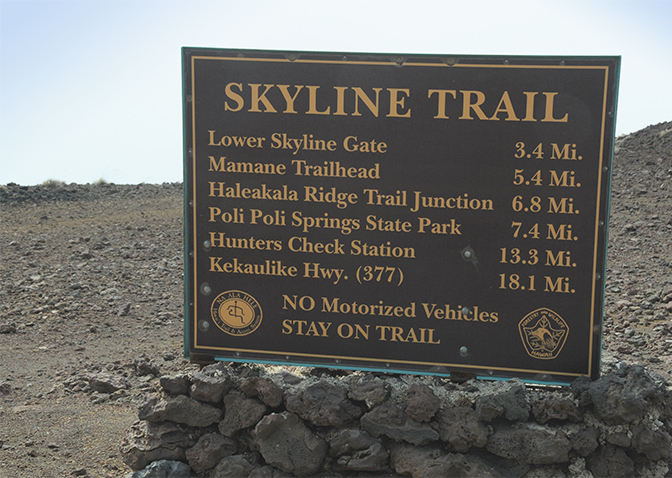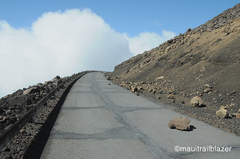 The first .5-mile of the trail is a paved road that used to be open to vehicles. Frequent rockfalls made this a risky propostition. BTW: Bicycle riding down the Haleakala Highway is a popular tourist activity. But the real thrill is the Skyline Trail, free of cars with spectacular scenery.