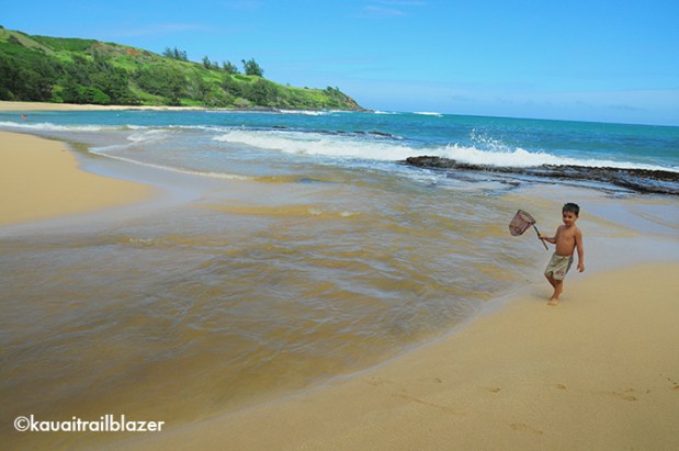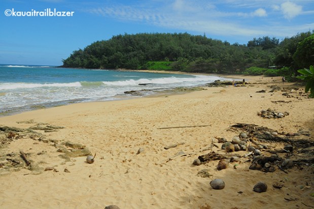 Few people head the other way around the bay, a beachcomer’s stroll along a reefy shore break. At the far end of the bay are the Moloa’a Baths—pools and channels in an onshore coral reef that are favored by reef fishermen and snorkelers. As is the case with all beaches, be cautious when the surf is up, since high surf equals stronger rip current.