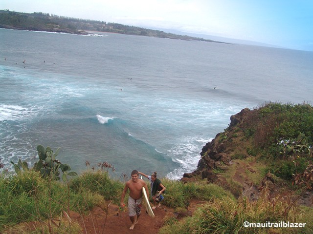Surfers need to navigate a steep trail to get to the wave machine. Specators can relax at a cliff right above the action, one of the best places in Hawaii to watch surfers.