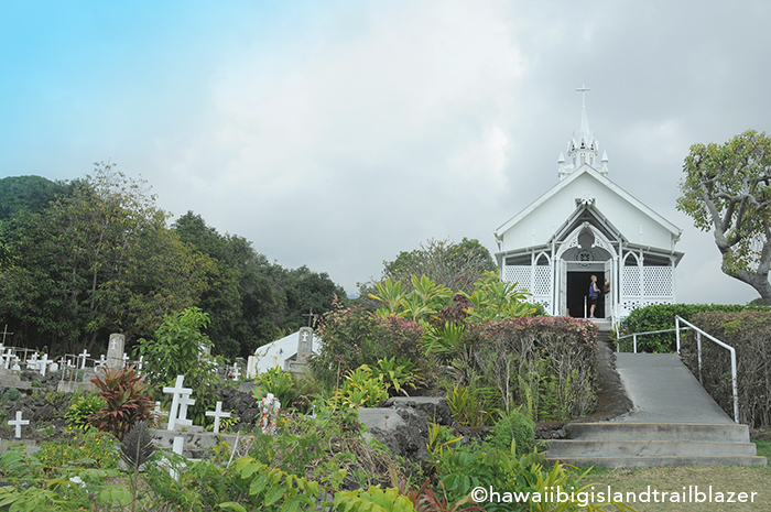 Farther north in Kona on the steep slopes of Honaunau, the well known Painted Church (below) has big views of Kealakekua Bay. Father John Berchman Velge adorned the Catholic Church’s wooden walls with tropical-themed Christian murals in 1898.