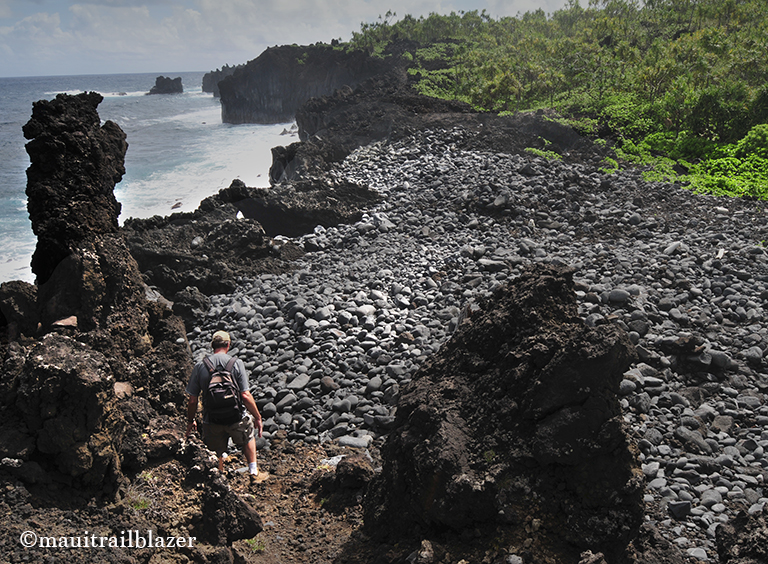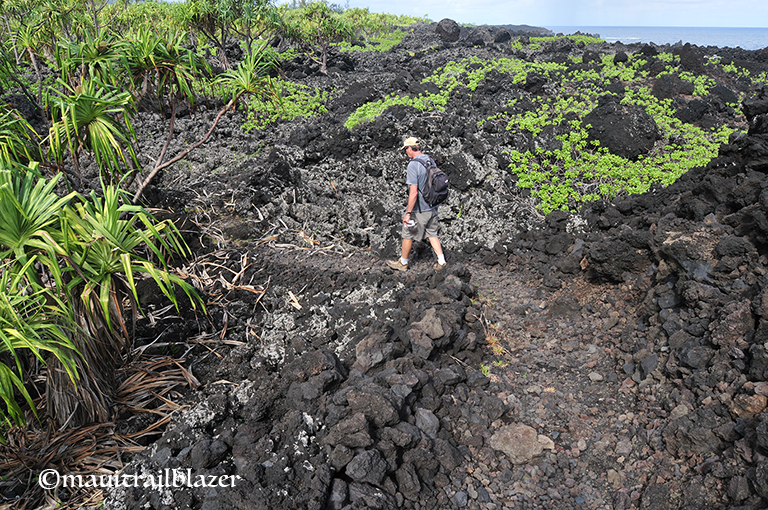 A trail—part of the ancient King’s Trail—leads north from Black Sand Beach past the ruins of heiaus and an ancient burial site.