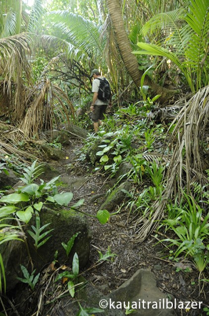 The trail leaves the beach view and penetrates greenery. A navigation heiau (temple) was located here, but its ruins have been lost to plantlife and erosion.