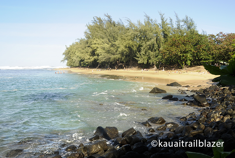 Ke’e is a reef-protected cove, with enough fish to please snorkelers. This shot is taken from an unsigned trail that skirts the cove to a point. In ancient times, Hawaiian girls would have to swim this opening, said to be the home of tiger sharks, as a last part of their initiation to become hula dancers. Don’t worry about sharks, but avoid the opening, since it is a one-way riptide ticket to open waters.