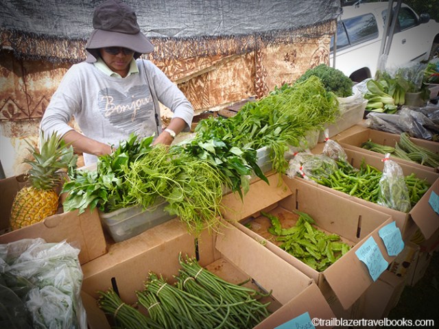 Many restaurants, of course, feature locally grown produce, but you will be paying a premium for small portions. Instead, plan to pick up a low-cost cornucopia of tropical goodies at the beginning of your visit. In the offing are apple bananas, machette-whacked coconuts, papayas, mangos, avocados, a wide-range of citrus, leafy greens, flowers, and herbs—plus some exotics you’ve possibly never imagined, like soursop, star fruit, rambutan, and lilikoi. Enjoy these fresh foods, and you’ll go home with Hawaii in your body as well as your memories. From the pages of Trailblazer Travel Books (one for each island) here are some directions to get down the garden path while on vacation.