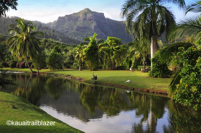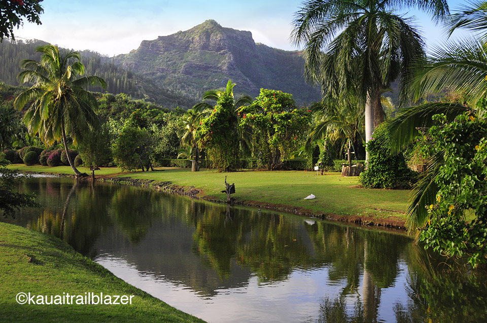 The supine profile of the Sleeping Giant (Nounou Mountain) lords over the length of Kauai’s Coconut Coast (the east shore). Seen here from a lagoon at Smith’s Tropical Plantation, the Giant resembles an Easter Island statue—his big nose is in the middle, with chin to the right.