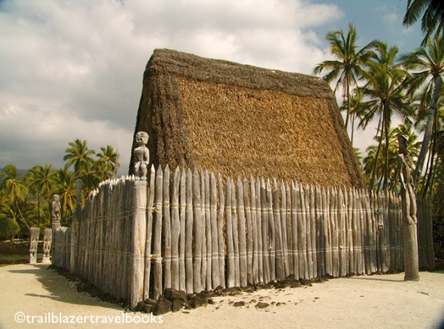 Hale o Keawe, where the remains of 23 ali’i (chiefs) are interred, is one of the significant historic sites at Pu’uhonua o Honounou. The park’s Great Wall dates from the 1500s—10 feet high, 7 feet thick, and about 1,000 feet long. It was built to separate the royals who lived here from the people seeking refuge. One of Kamehameha’s wives hid out for a while when she got on the wrong side of the big guy.