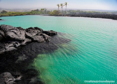 Although the sand is coarse at some South Kohala beaches, the waters are crystal clear, since there is little erosion and no stream runoff. Many of the beaches are wild, like Blue Lagoon, the turtle enclave pictured above.