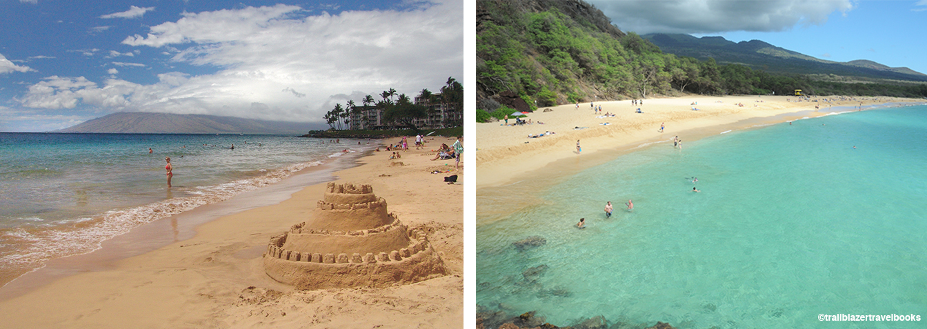 Wailea has five beaches, sandy coves all good for snorkeling. Just to the north (there is a walking path) are the three Kamaole Beach Parks (above left), among the best family beaches in the Islands. Just south of Wailea is perhaps Hawaii’s most-smashing beach experience, Makena State Park, better known as Big Beach (above right).
