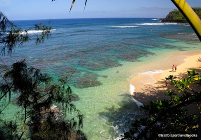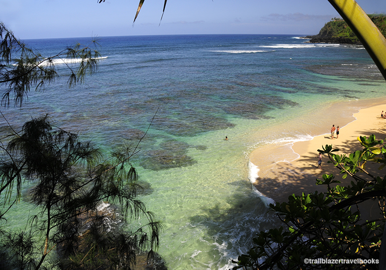 About 12 of Hawaii’s top-20 wild beaches (many involve a short hike) are along a 30-mile run of coastline from Anahola to road’s end at Haena. The beauty above, Hideaways Beach, is down a rugged trail that is right next to the entrance of the St. Regis Princeville Resort.