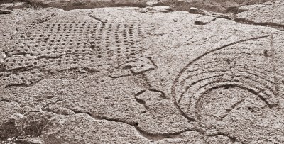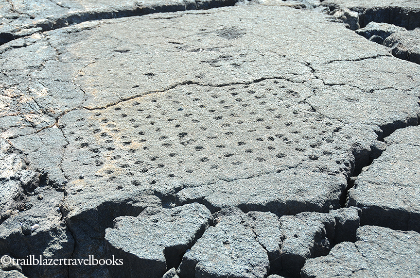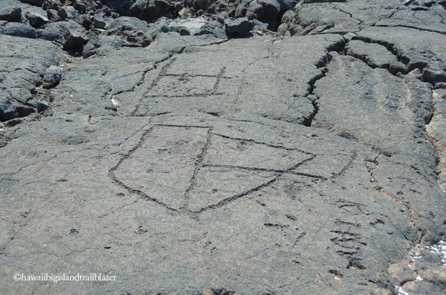 Not all rock etchings told the stories. This rectangle pattern of dots was made to play a form of checkers common throughout Hawaii.