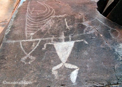 The best field on Maui is in Olowalu Cultural Preserve. This petroglyph depicts an ancient sailing vessel and a classic human form.
