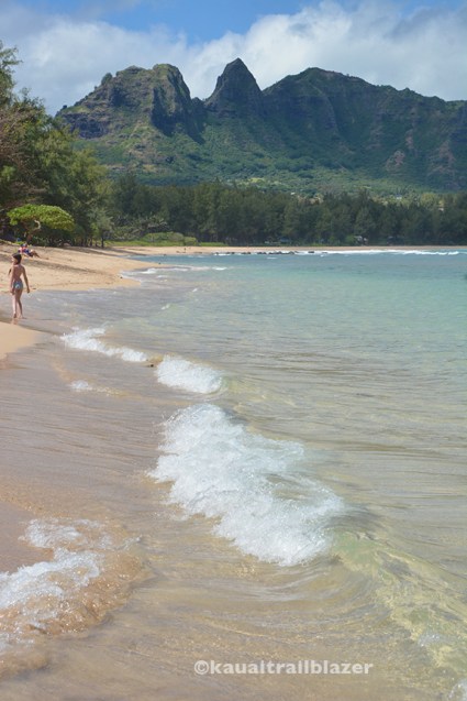 From the beach park, you can walk the surf line for a few miles along a strip of yellow sand all the way to Aliomanu Bay. A county campground and cottages lie along a backshore of ironwoods and coco palms. That pointed peak in the ridge is known as “Kong,” after the mythical movie gorilla. Some scenes from the film were shot here.
