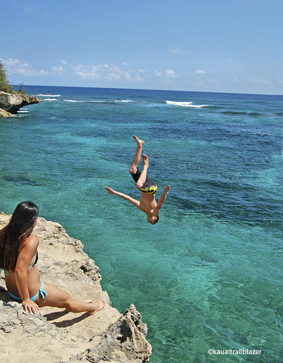 Though jumping off rocks is generally not a good idea, these bluffs at Kauai’s Mahaulepu Beach are safe. The urge to leap is nearly magnetic.
