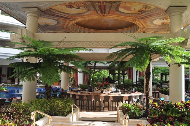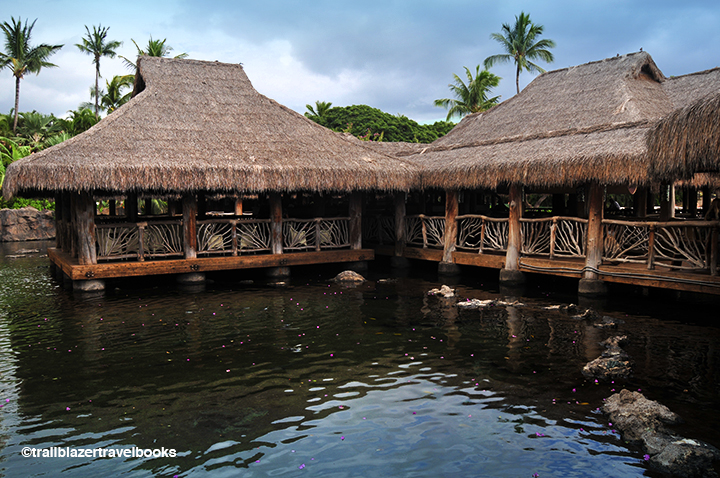 The grounds of destination resorts are islands unto themselves, like these resaurant cabanas at Kauai’s Grand Hyatt Poipu.