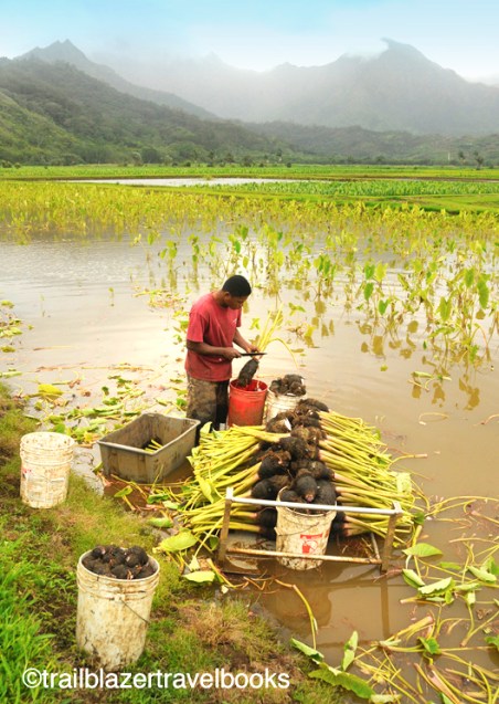 Hanalei Valley, much of it part of the Hanalei National Wildlife Refuge, is the largest taro field in Hawaii. Taro was one of the 23 plants brought from Polynesia in ancient times and its roots are used to make a mush called poi. Most tourists wrinkle their noses at poi. Try taro chips.
