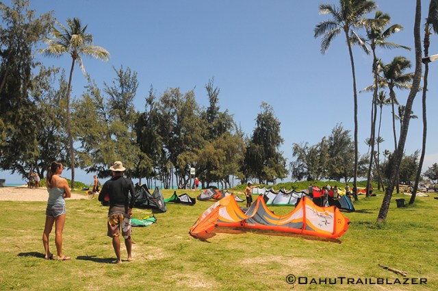 Kailua Beach Park is a kissing cousin to Lanikai, via a short walk. The scene amps a bit here, with a huge lawn to host other fun-sun activities (like these kite-boarders prepping to take off). There’s plenty of shade and picnic tables along a wide greenspace. A cold brew, ice cream, and other gotta-haves aren’t far away.